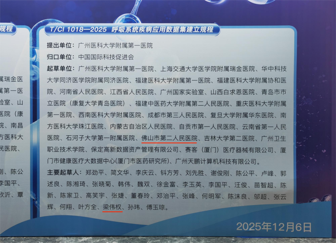 佛山市第二人民医院呼吸与危重症医学科是国家呼吸健康大数据平台核心单位、国家疑难病诊治提升工程呼吸介入大数据信息化平台合作单位。此次作为起草单位参与《呼吸系统疾病应用数据集建立规程》的制定,体现了我院在学科建设与医疗质量管理方面取得的成效获得了国家级平台的关注与认可。医院将继续支持并推动数据标准化建设在各临床科室的落地,积极探索数据驱动下的医疗服务模式创新与科研突破。